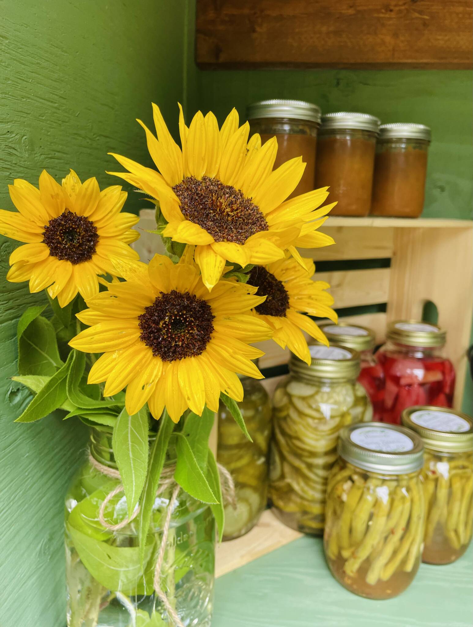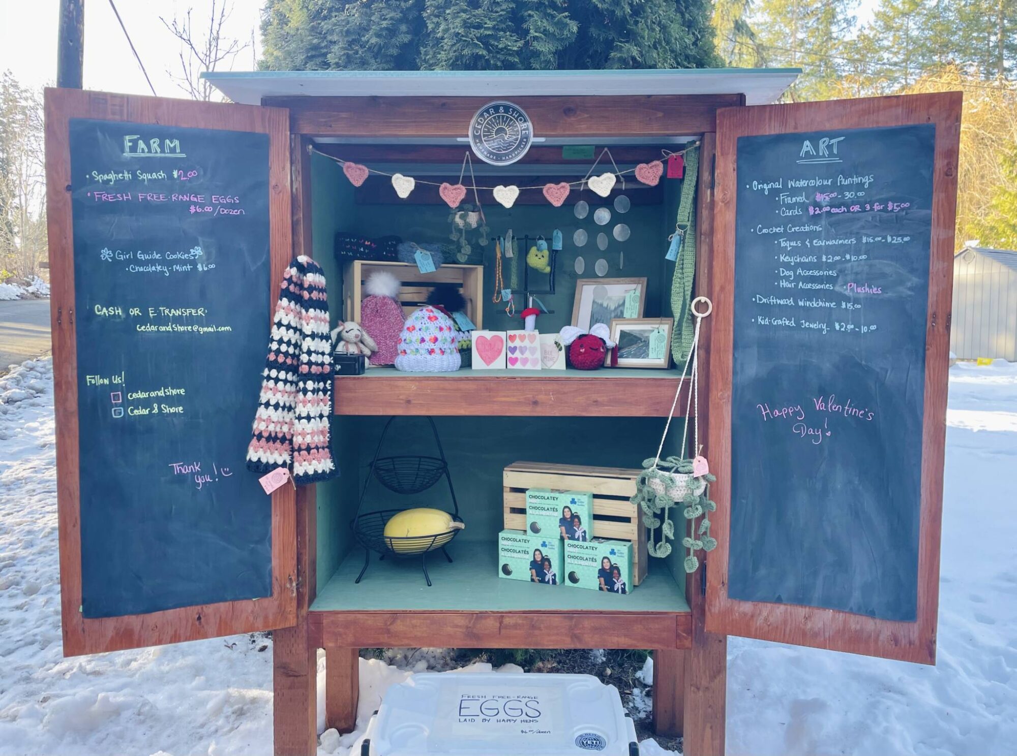 Eggs, fruit, vegetables, flowers, starters, preserves, crochet creations, paintings, cards, soap, treats, kid-crafted jewelry