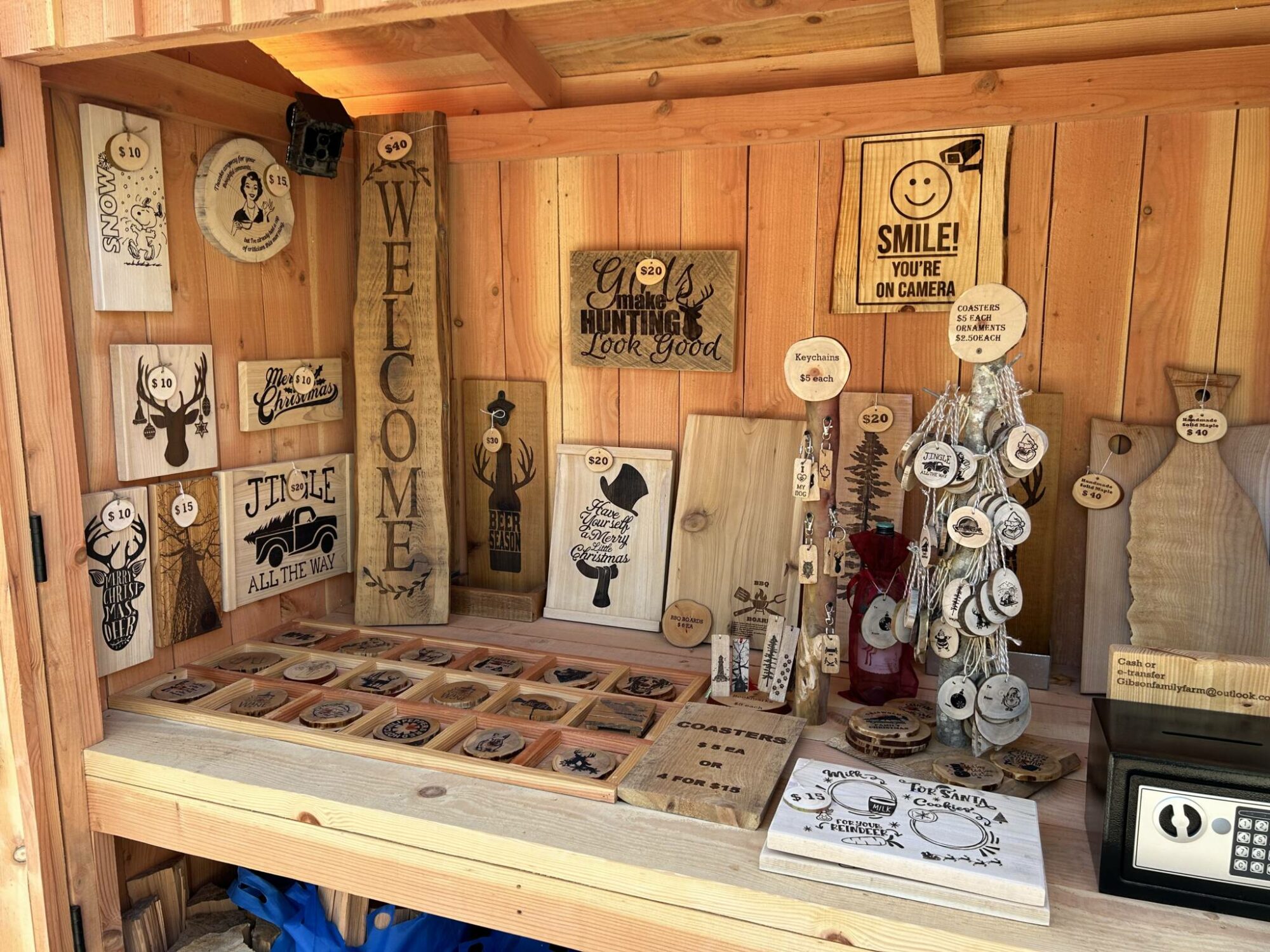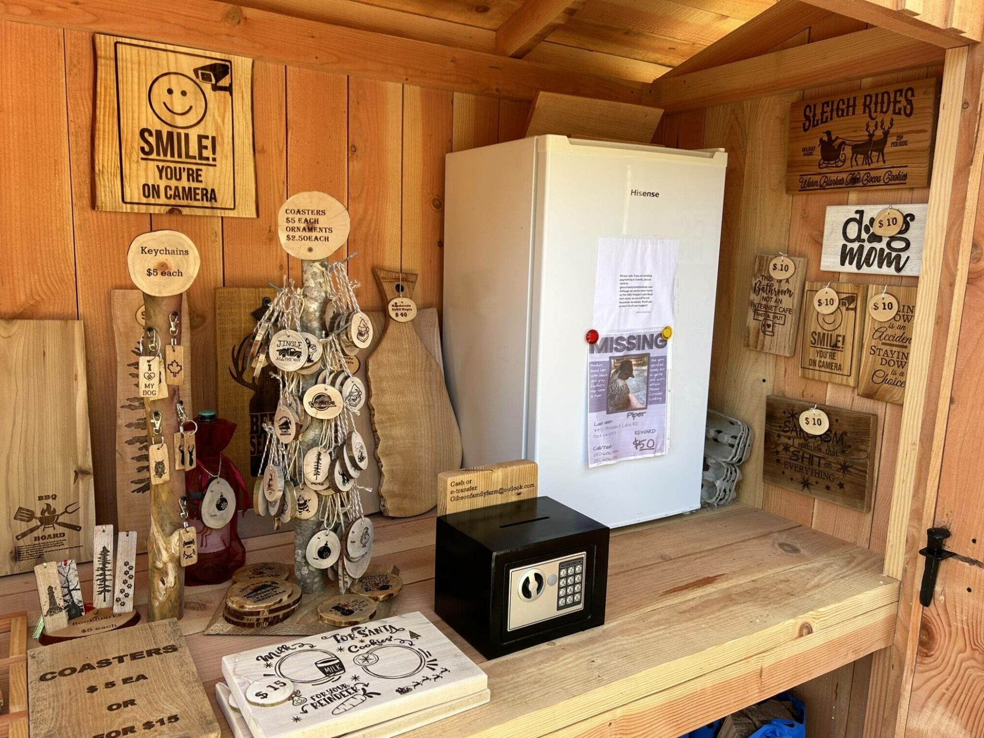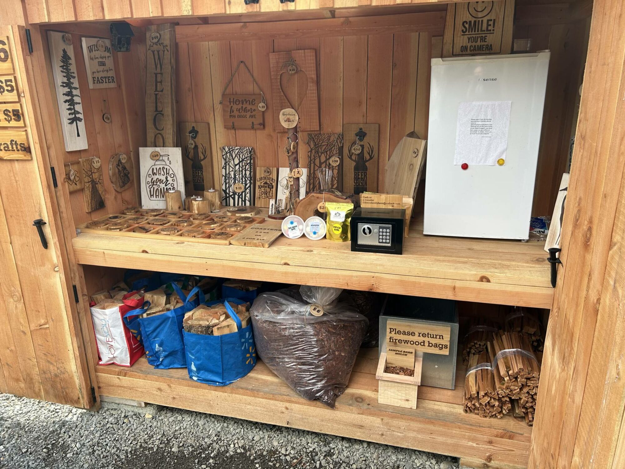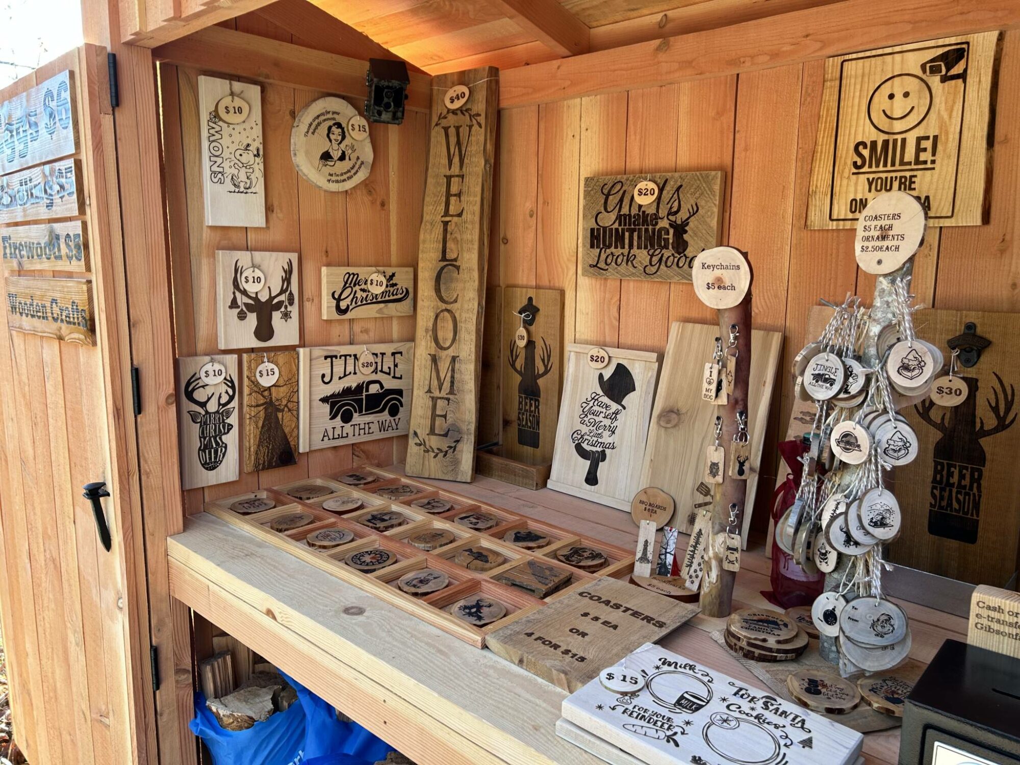 Eggs, baked goods, firewood, kindling, wooden crafts, signs, coasters, keychains, bookmarks,